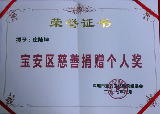 6月30日,宝安区慈善奖表彰大会暨2017年"广东扶贫济困日"活动启动仪举行,百佳华集团董事长庄陆坤等20人荣膺宝安区慈善个人奖。 乐善好施、扶贫济困,是中华民族的传统美德,在庄陆坤董事长引领和示范下,百佳华集团,以高度的社会责任感,大力助推公益慈善事业,弘扬公益精神,传递社会正能量,累计为社会各项公益事业捐款超五千万元,为公益慈善事业作出了积极的贡献。