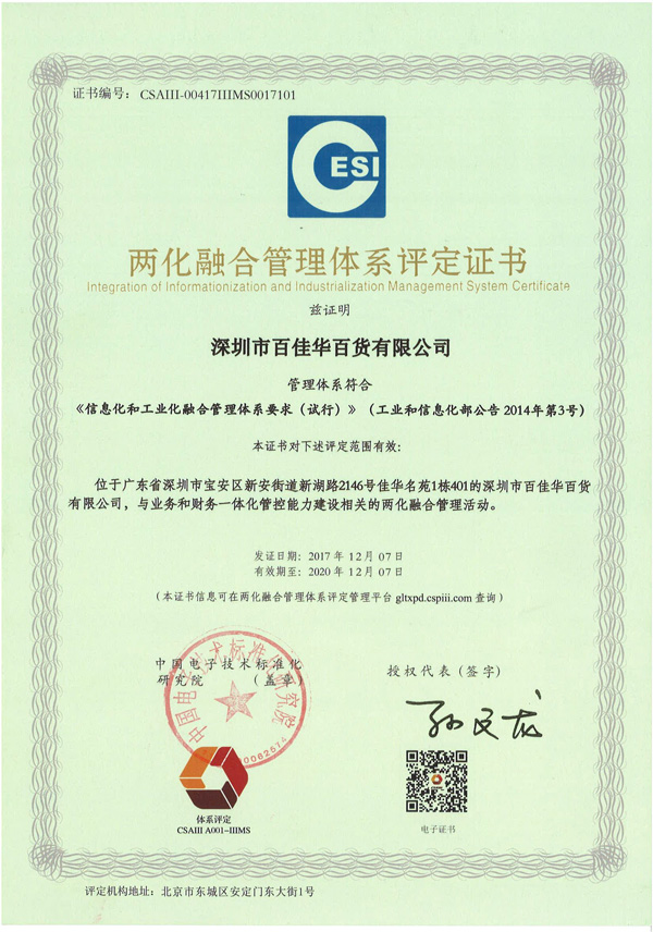 2017年12月7日,百佳华百货通过国家级「两化融合管理体系」认证评定,成为全国零售企业第一家通过「两化融合」评定的零售企业,同时也是现阶段全国1351家获得该项认证的企业之一。本次管理体系的评定范围为:与业务和财务一体化管控能力建设相关的两化融合管理活动。