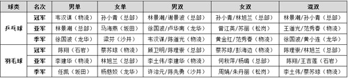 物流中心韦汉谋、超市事业部孙小青分获男、女单打冠军;信息中心的IT男林景潮、谢景波,代表总部出战,获得男子双打冠军,百货事业部林旭兰与孙小青组合获得女子双打冠军,林景潮与孙小青配对,获得男女混双冠军。